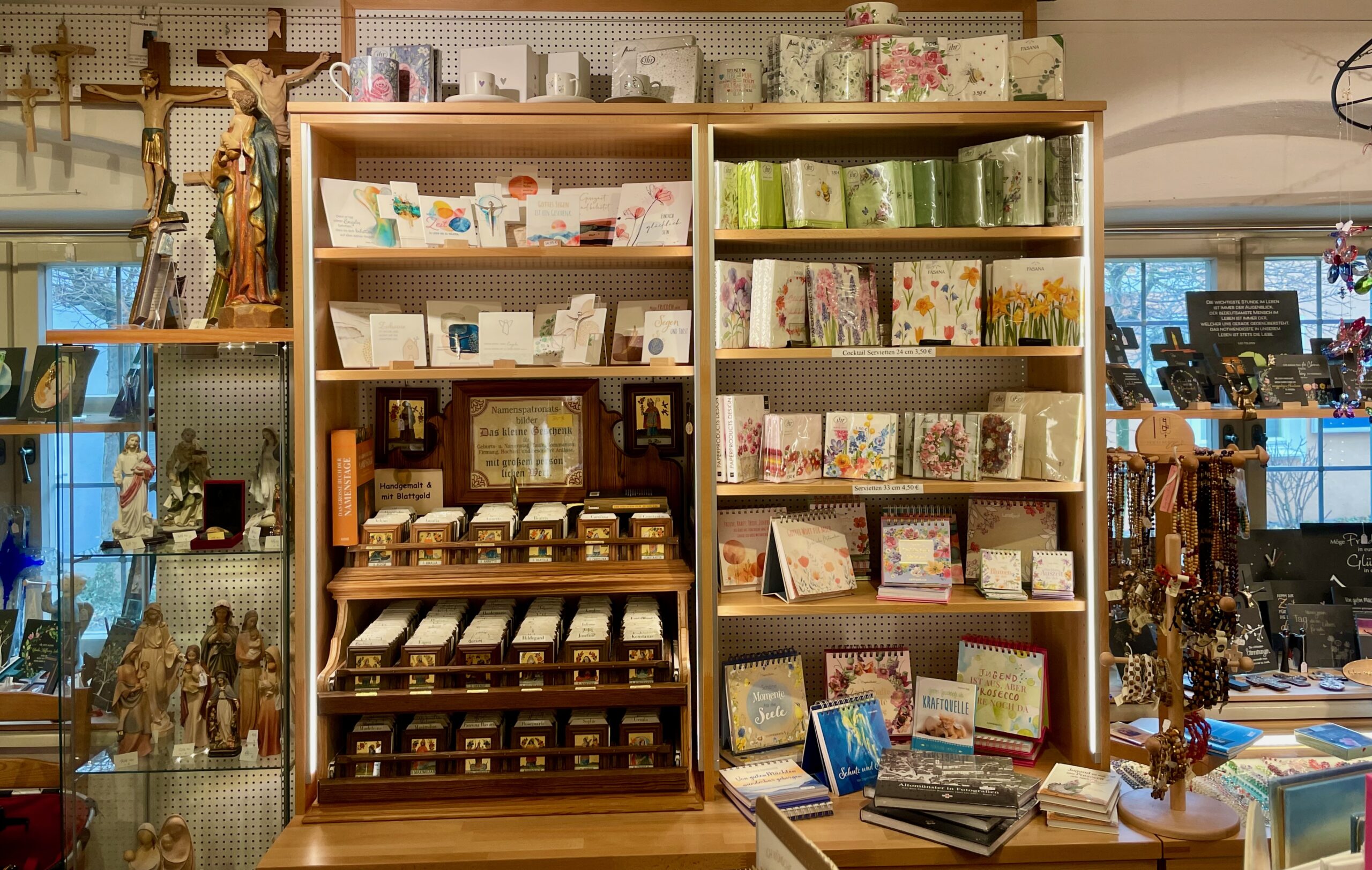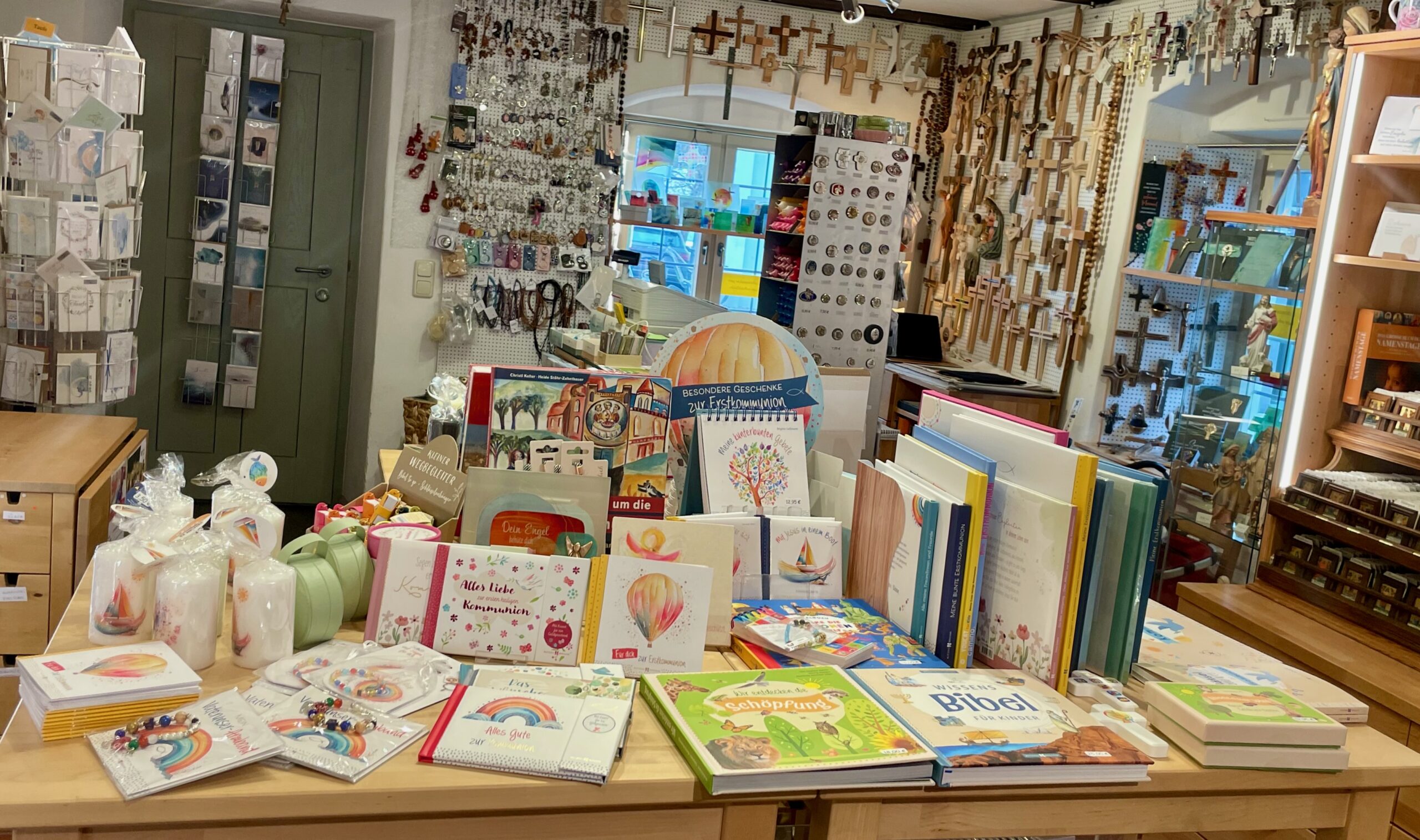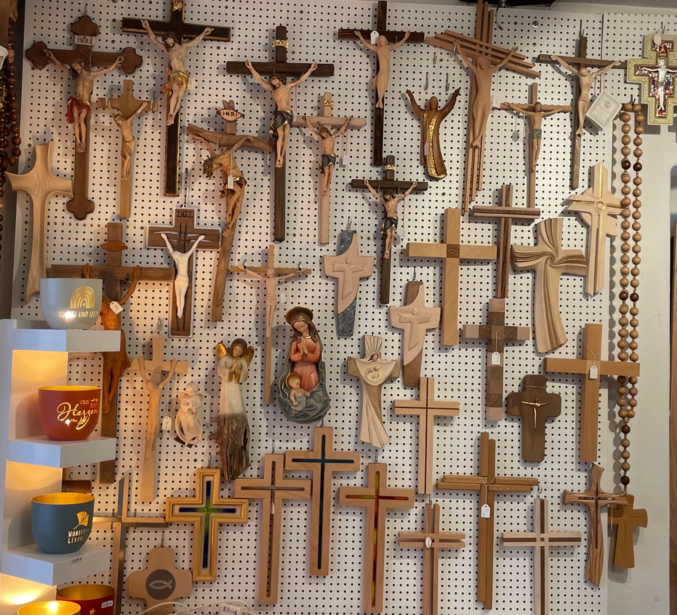 Kreuze in Holz, Glas, Schiefer, Marmor und Bronze; Kinderkreuze, Weihwasserkrüge und Weihwasserkessel, Rosenkränze, Engeln in verschiedenen Ausführungen und Materialen, Madonnen, Handschmeichler, Heiligenbilder, Weihrauch und Weihrauchstövchen, Schlüsselanhänger, Christopher-Plaketten und vieles mehr.