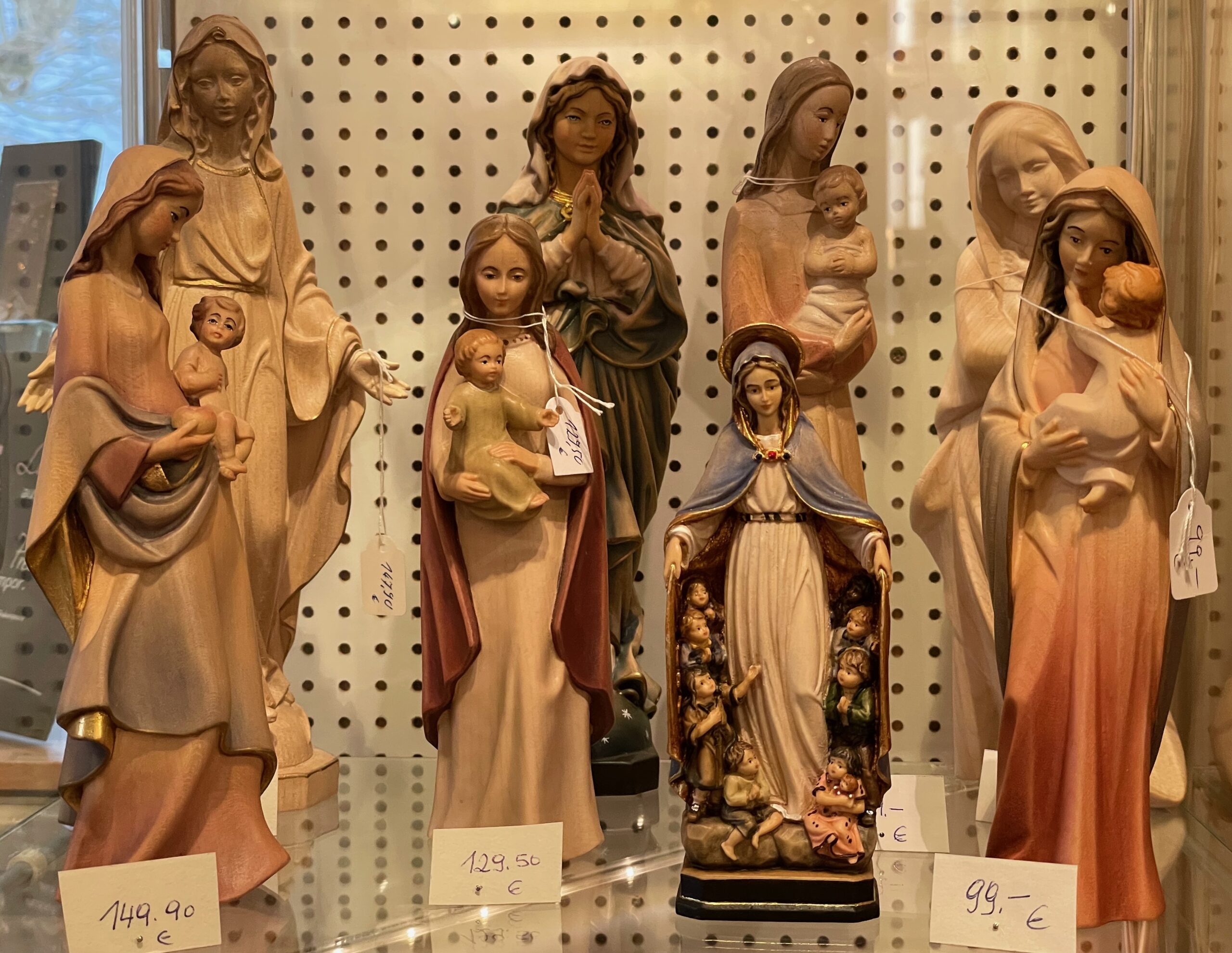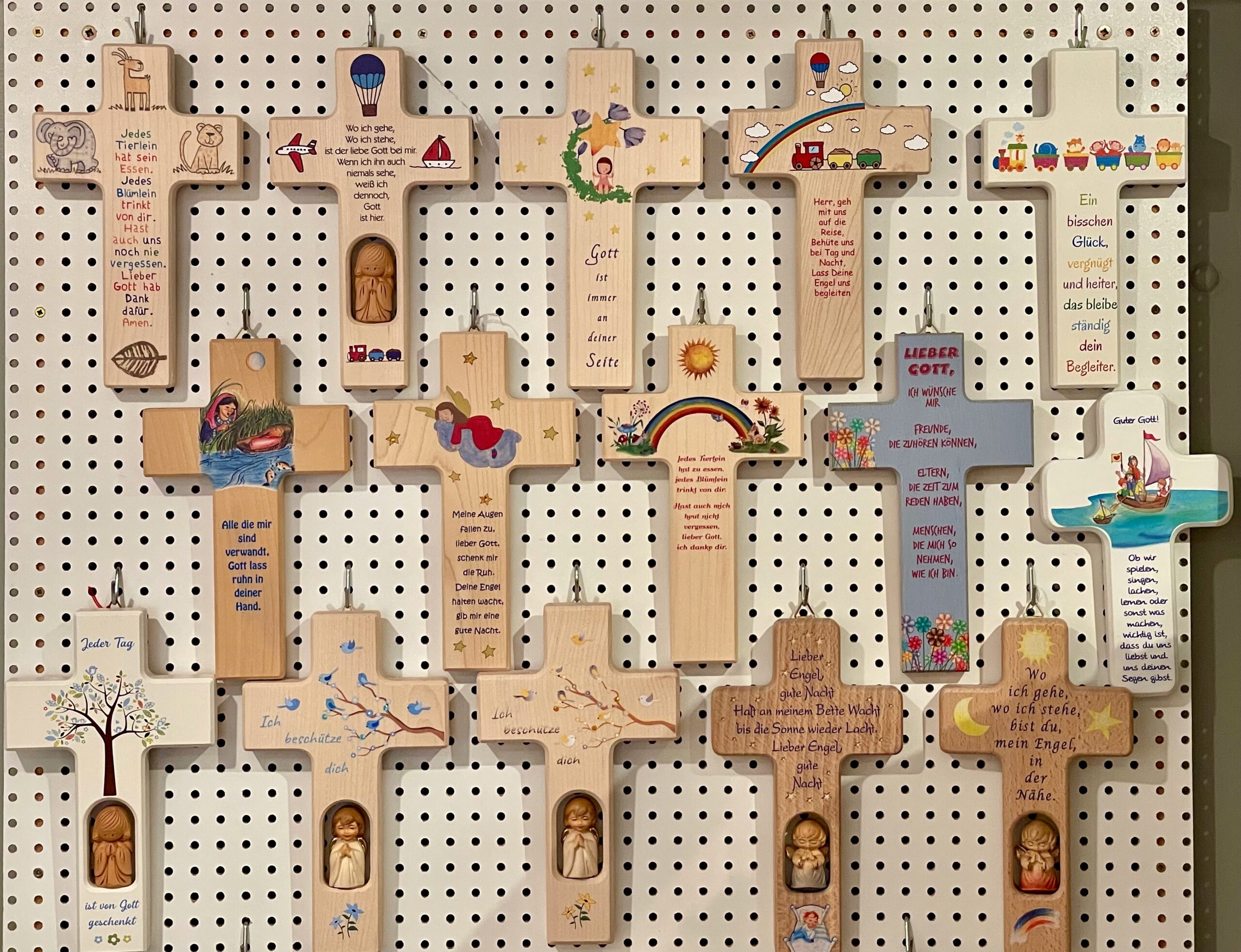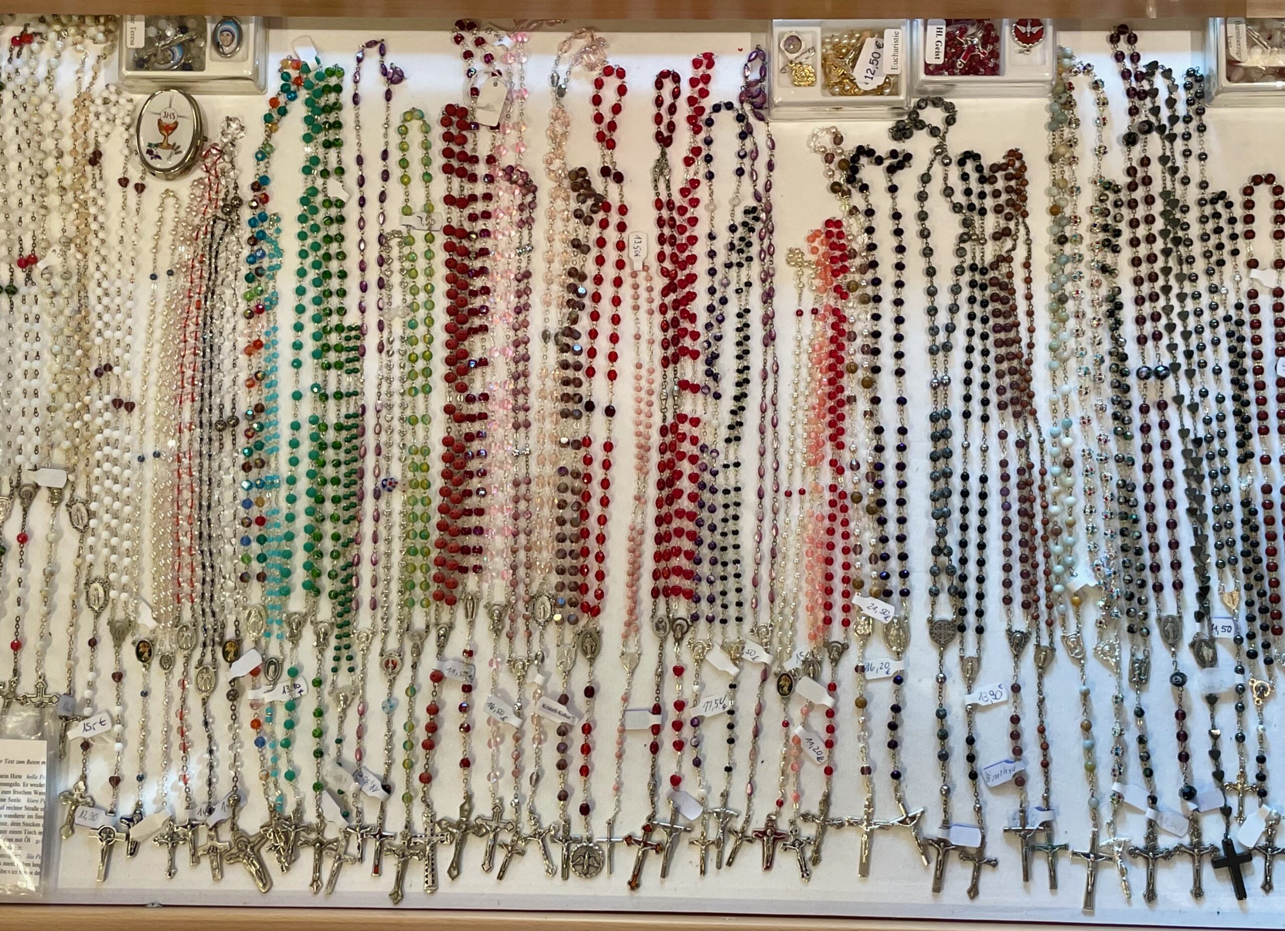 Kreuze in Holz, Glas, Schiefer, Marmor und Bronze; Kinderkreuze, Weihwasserkrüge und Weihwasserkessel, Rosenkränze, Engeln in verschiedenen Ausführungen und Materialen, Madonnen, Handschmeichler, Heiligenbilder, Weihrauch und Weihrauchstövchen, Schlüsselanhänger, Christopher-Plaketten und vieles mehr.