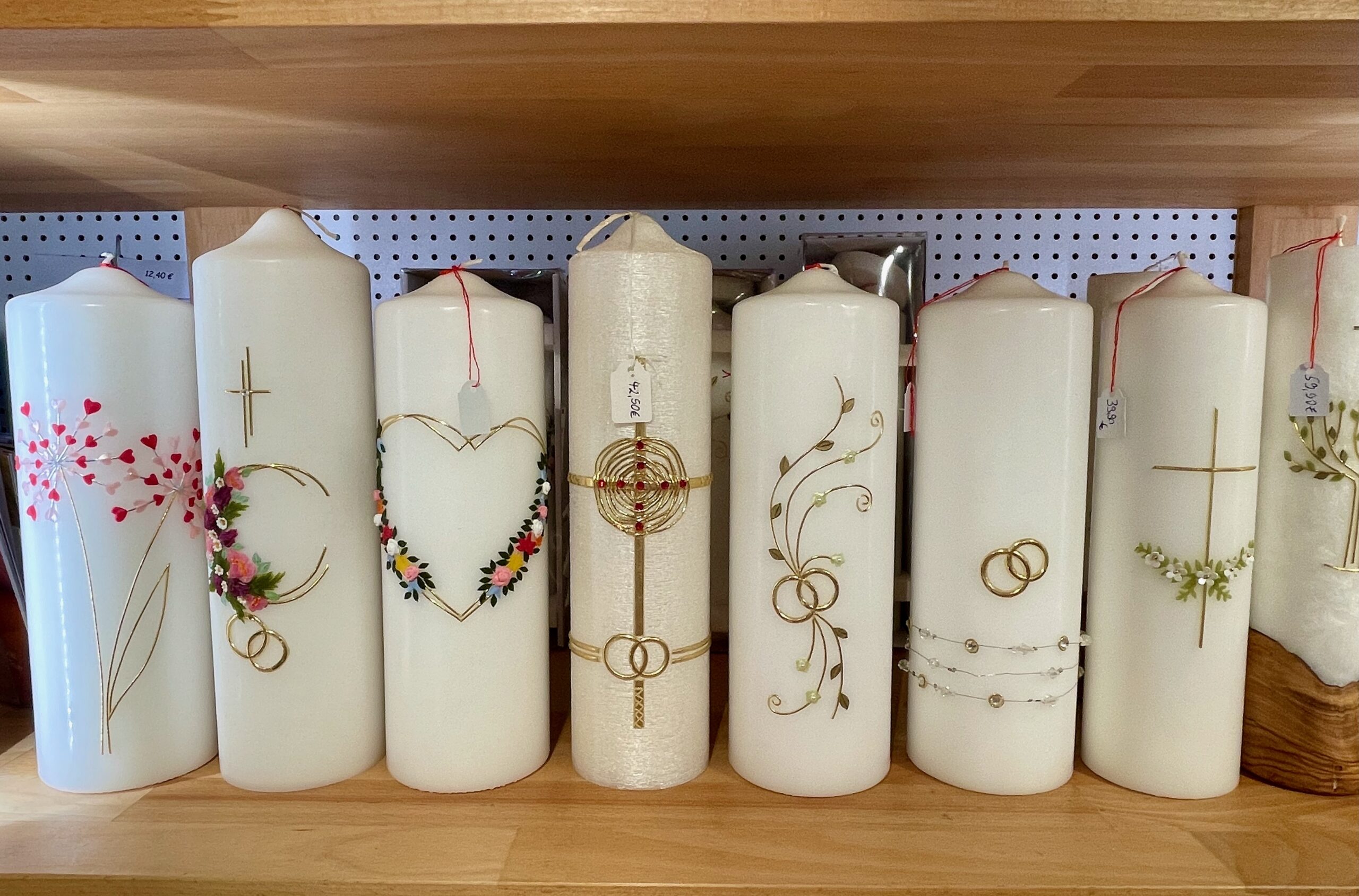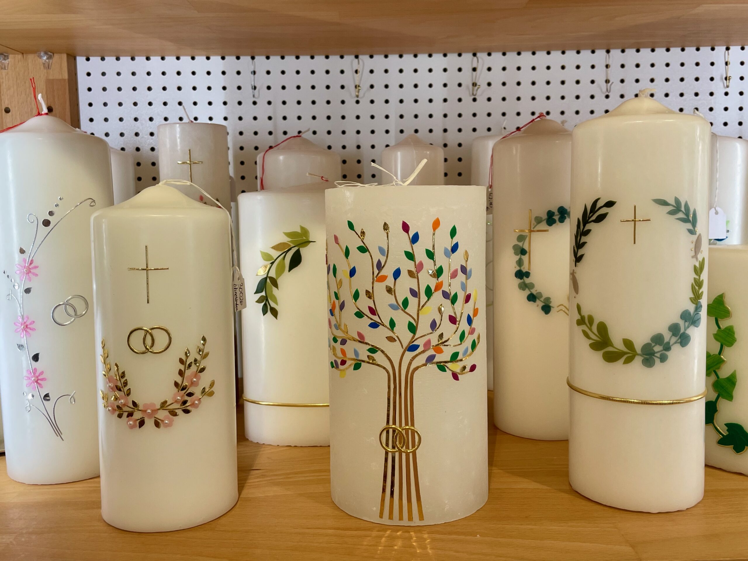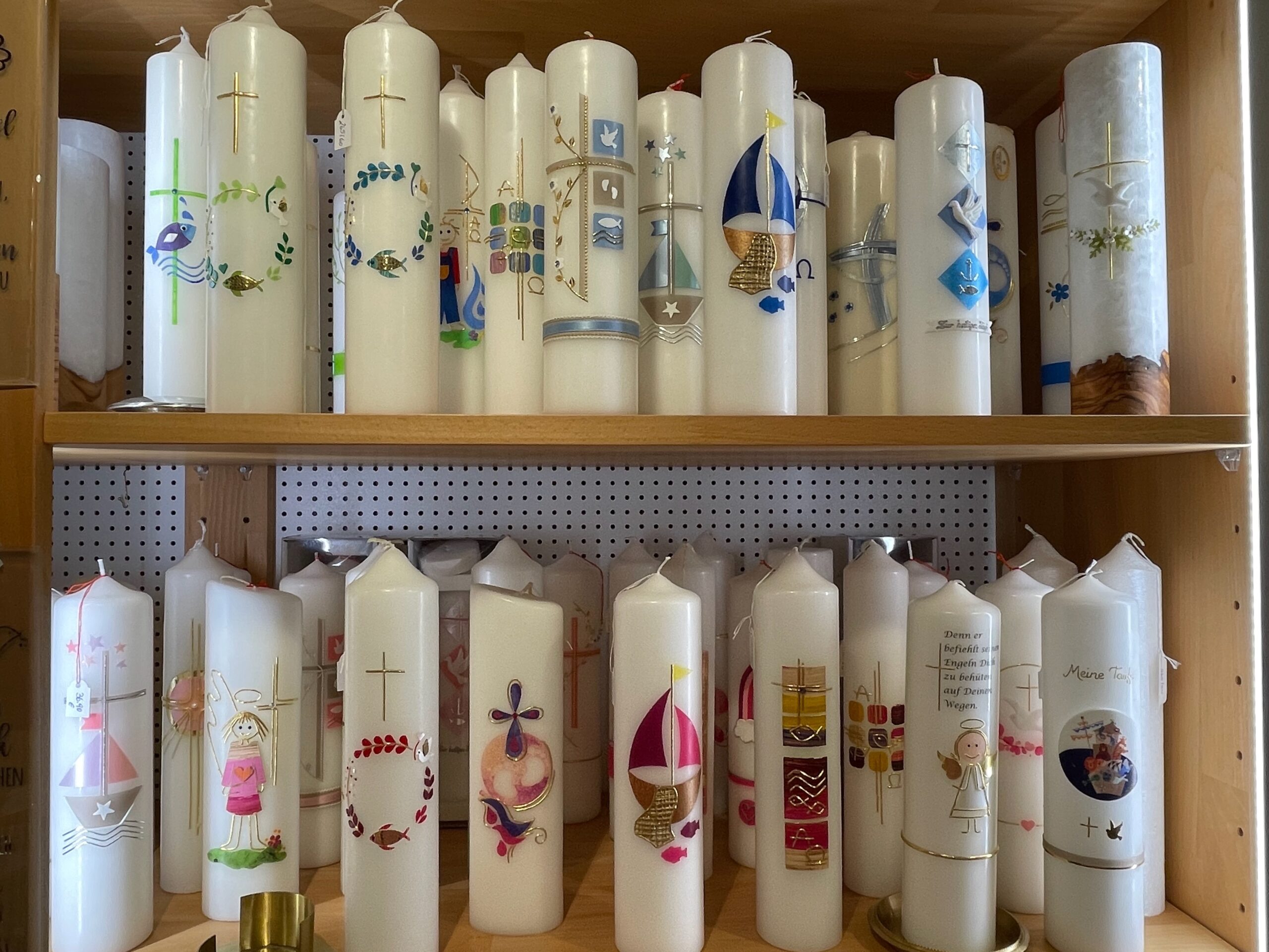 Taufkerzen, Kommunionkerzen, Hochzeitskerzen, Geburtstagskerzen, Trauerkerzen, Marienkerzen, Kerzen aus Altomünster, Birgitten-Kerzen, Wetterkerzen und Stabkerzen in verschiedenen Farben.