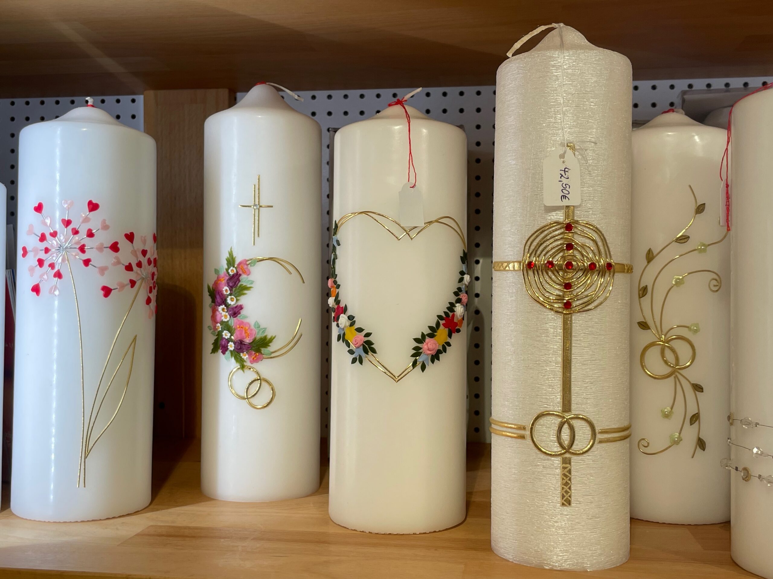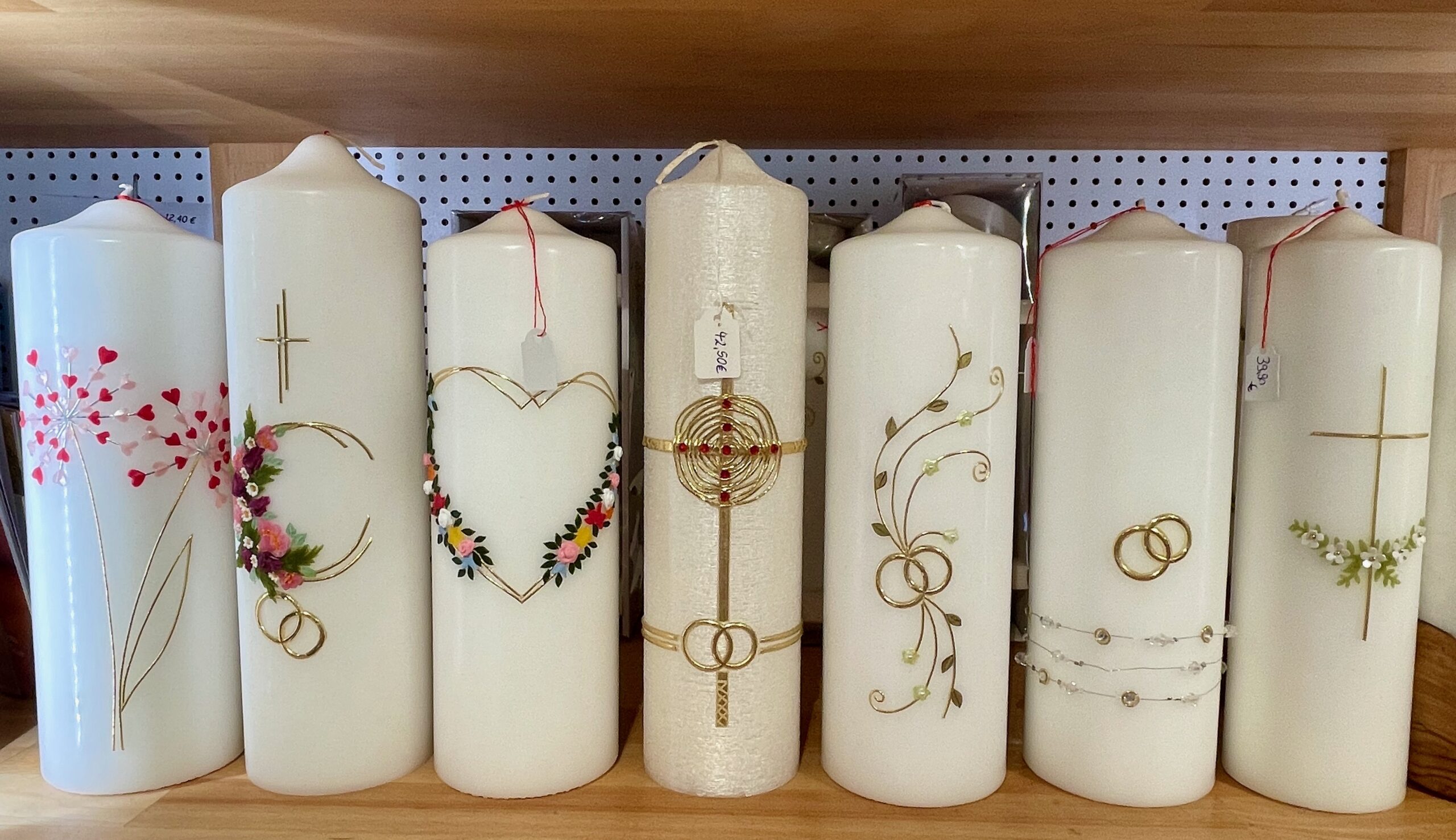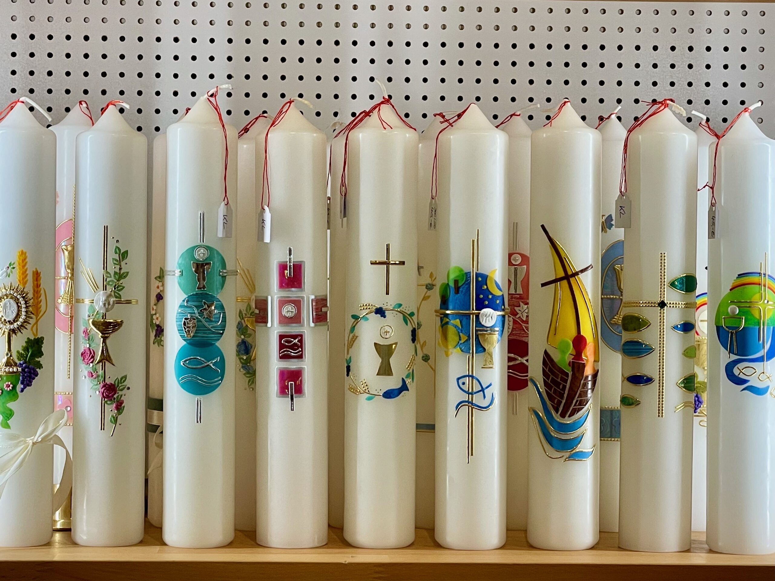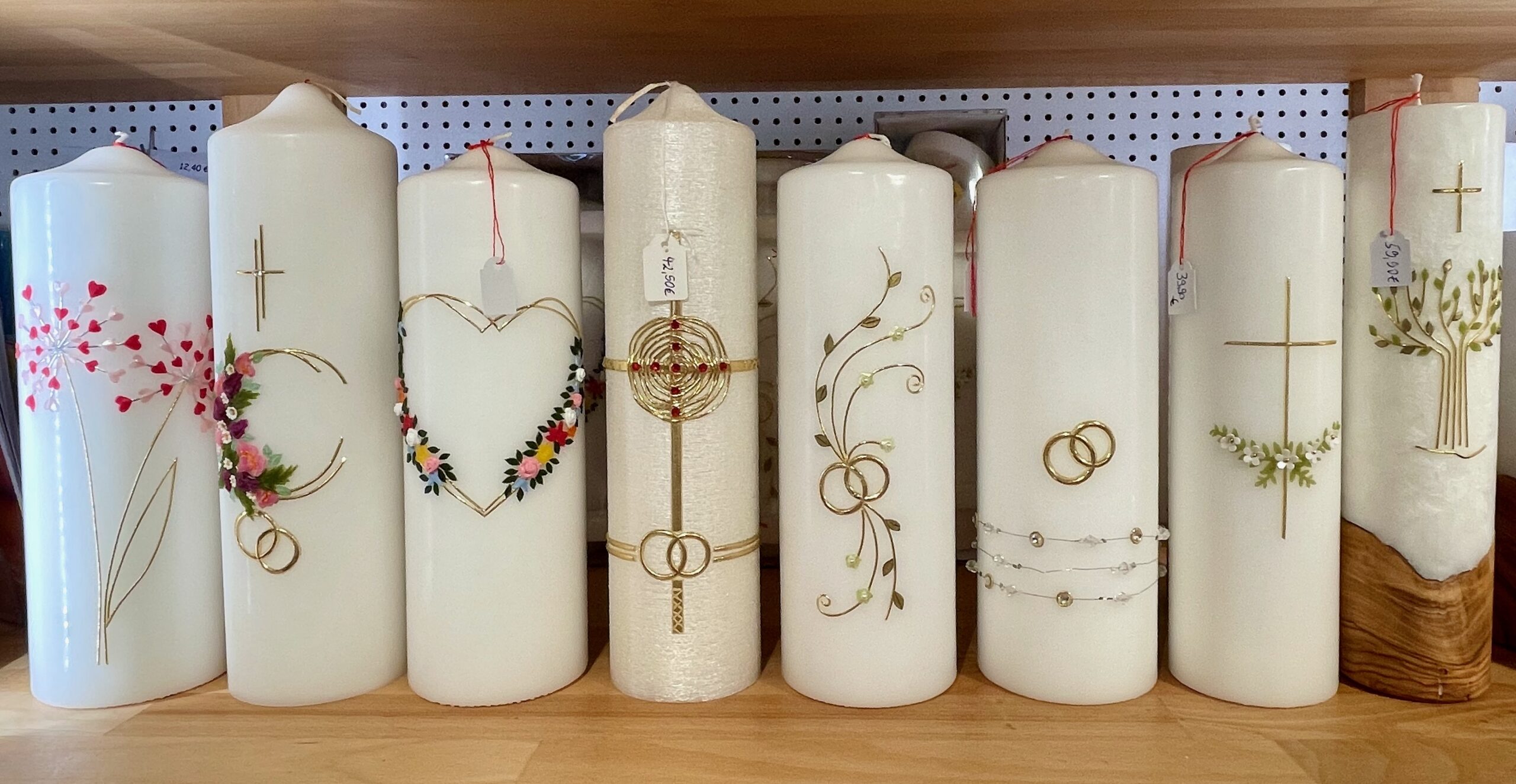 Taufkerzen, Kommunionkerzen, Hochzeitskerzen, Geburtstagskerzen, Trauerkerzen, Marienkerzen, Kerzen aus Altomünster, Birgitten-Kerzen, Wetterkerzen und Stabkerzen in verschiedenen Farben.