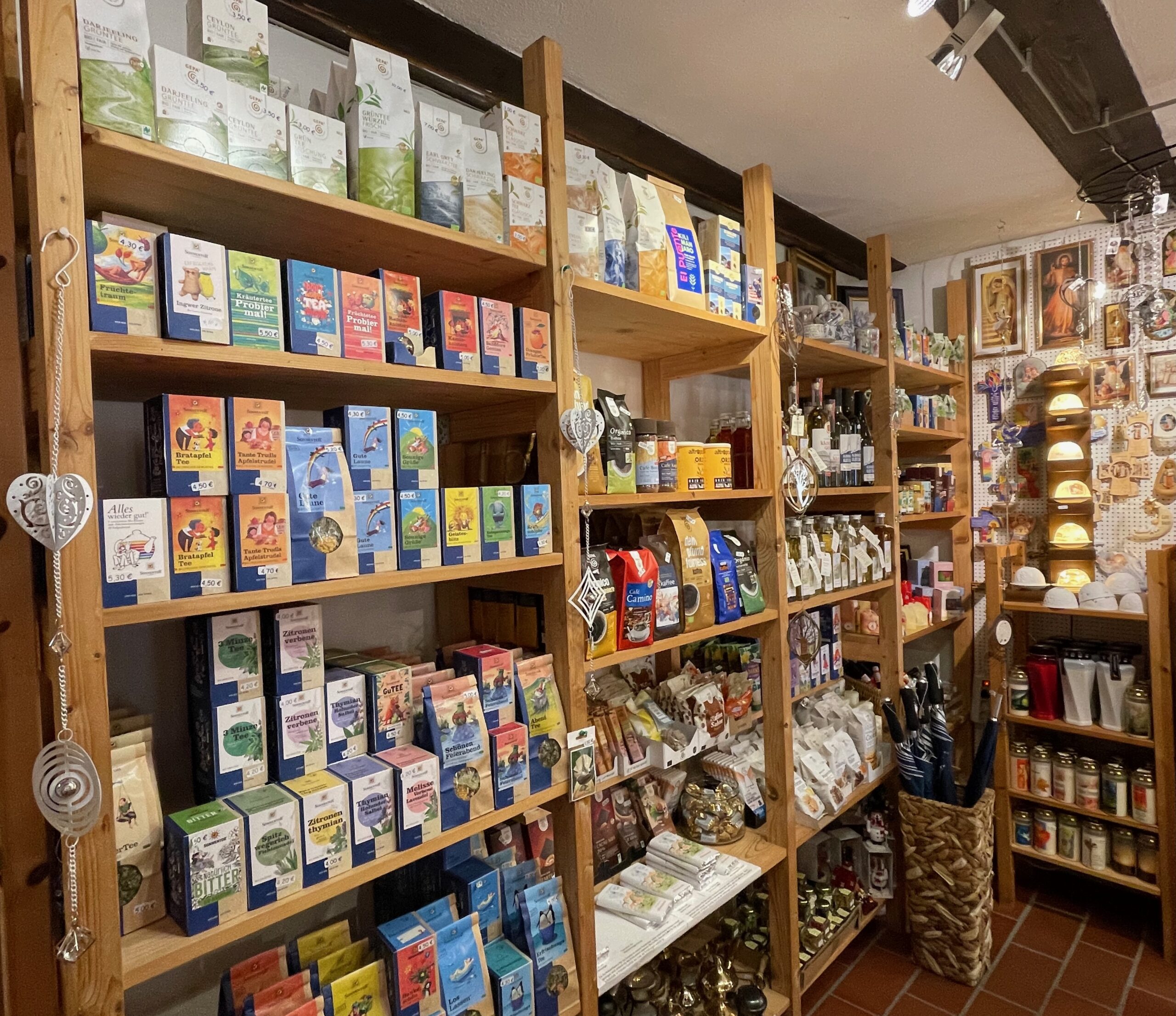 Kaffee, Tee, Gewürze von Sonnentor und Fairem Handel, Kekse und Süßigkeiten, Schokolade, Liköre und Schnäpse.