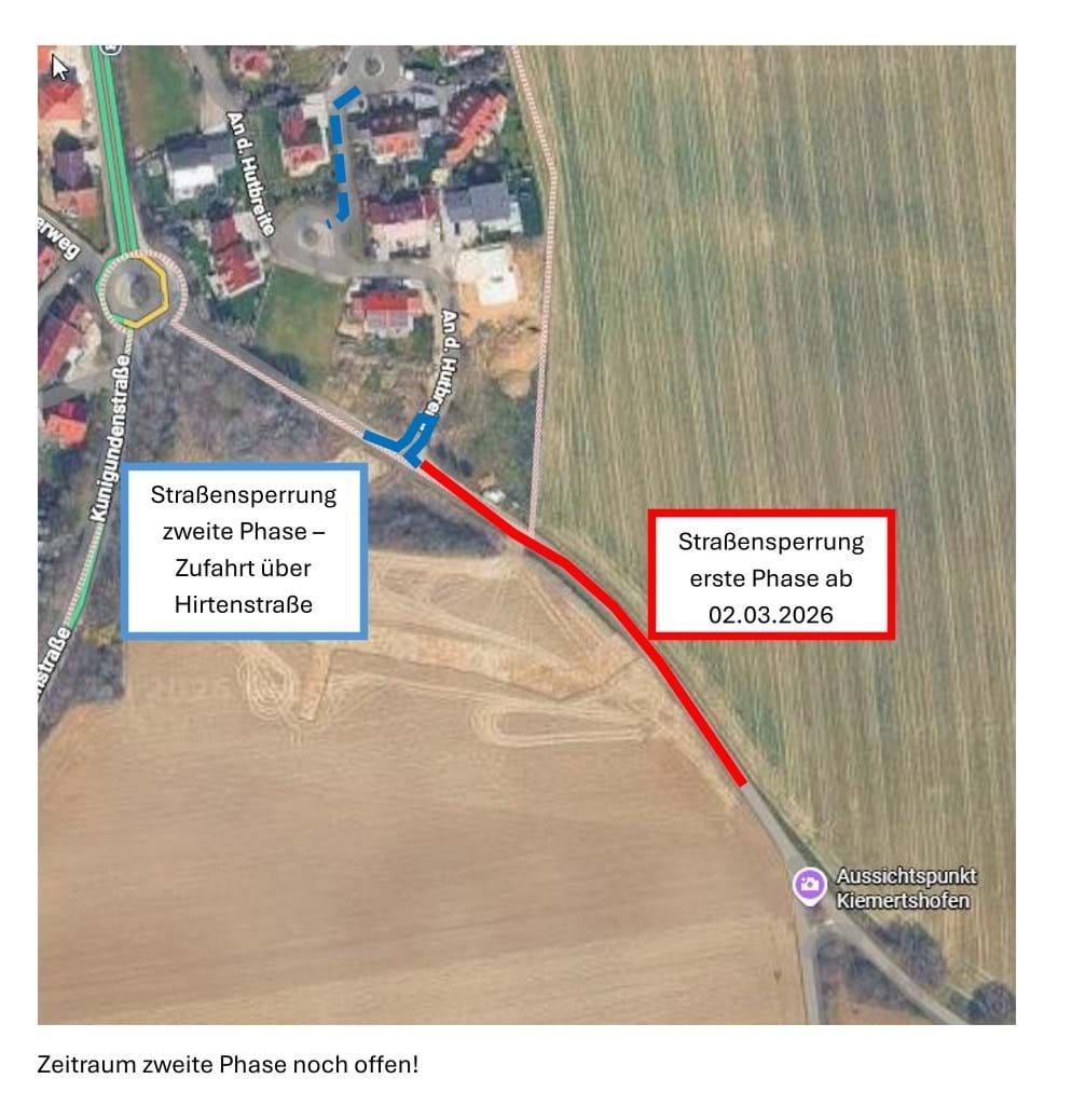 02. März 2026 : Im Zuge der Erstellung des Neubaugebietes „Südlich der Übelmannastraße“ erfolgt nun der Vollausbau der Bestandsstraße. Im ersten Abschnitt, beginnend ab 02.03.2026, erfolgt der Ausbau ab der Einmündung „An der Hutbreite“ Richtung Übelmanna. In der zweiten Phase, der Beginn ist abhängig vom Verlauf der ersten Phase, wird der Bereich zum Neubaugebiet und "An der Hutbreite" ausgebaut.